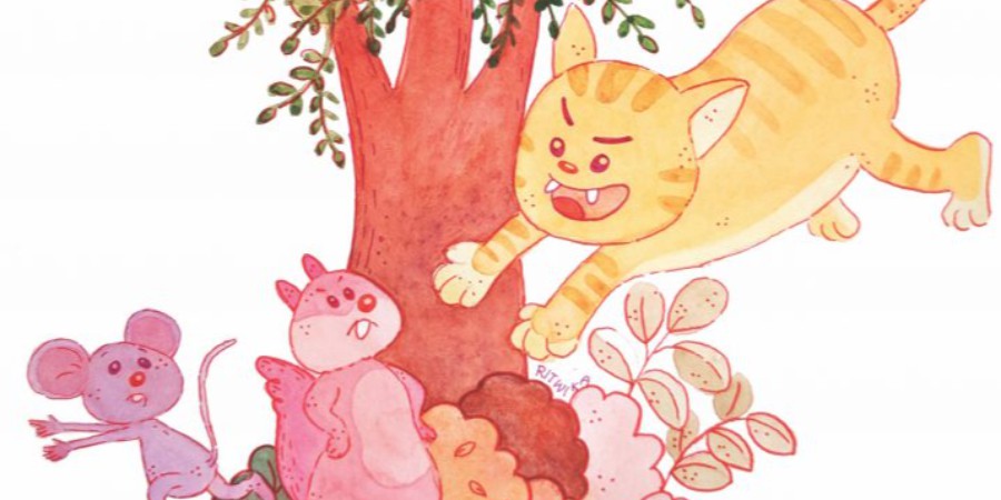 Robbie rat was nibbling on some grains under a tree, when he heard Billu cat approaching. He started trembling. He got so busy looking around to see where Billu was coming from, that he forgot all about running away. Just as Billu was about to pounce on Robbie, Sweety